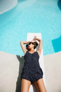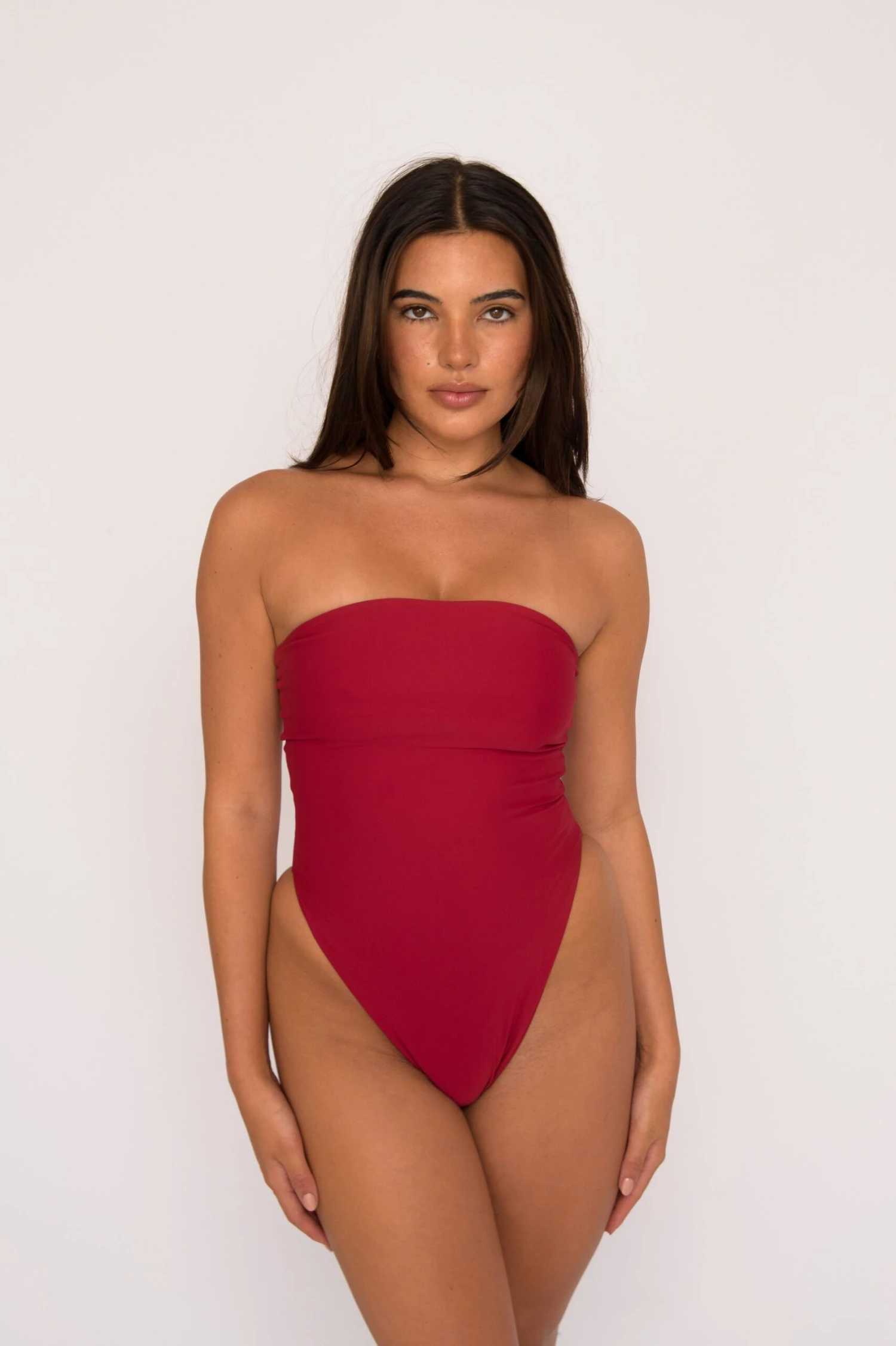 Amy is the chicest one piece you’ll own! She comes with no straps, but made very snug with elastic to hold the girls in perfect place. We gave her a super high leg allowing for the tall girlies to hike up even more if needed and a bit of cheekier coverage.