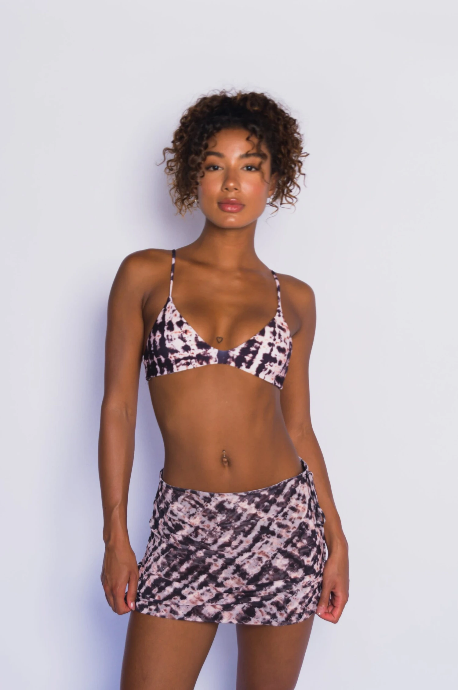This mini mesh skirt is the perfect cover-up, with a tie side and fabric covered buttons Avalon is the easiest throw on making you look oh so chic when going from beach to pool.