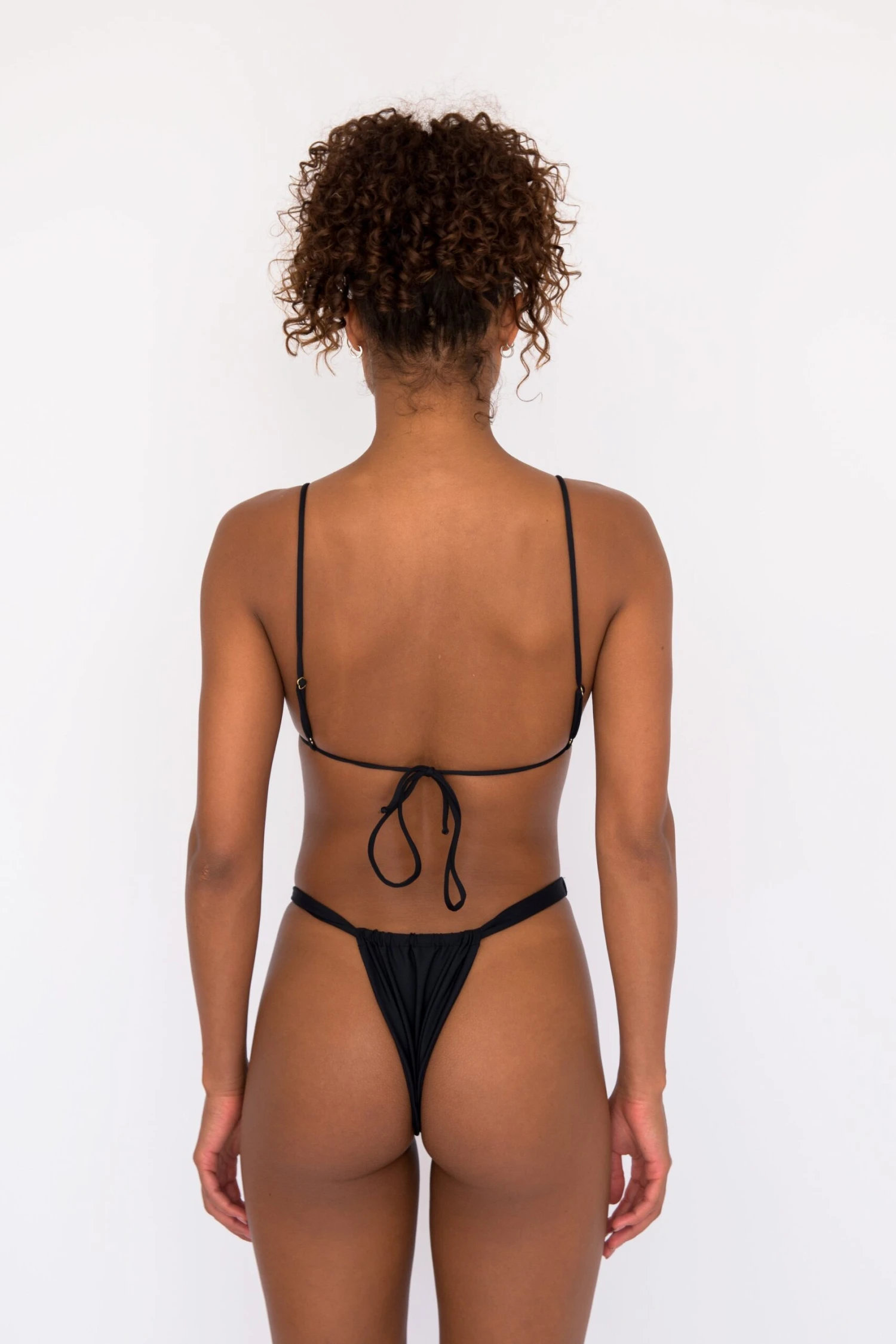 A dainty ruched bralette with a fully adjustable skimpy string style back so that you have the illusion of coverage in the front and minimal tan lines in the back.